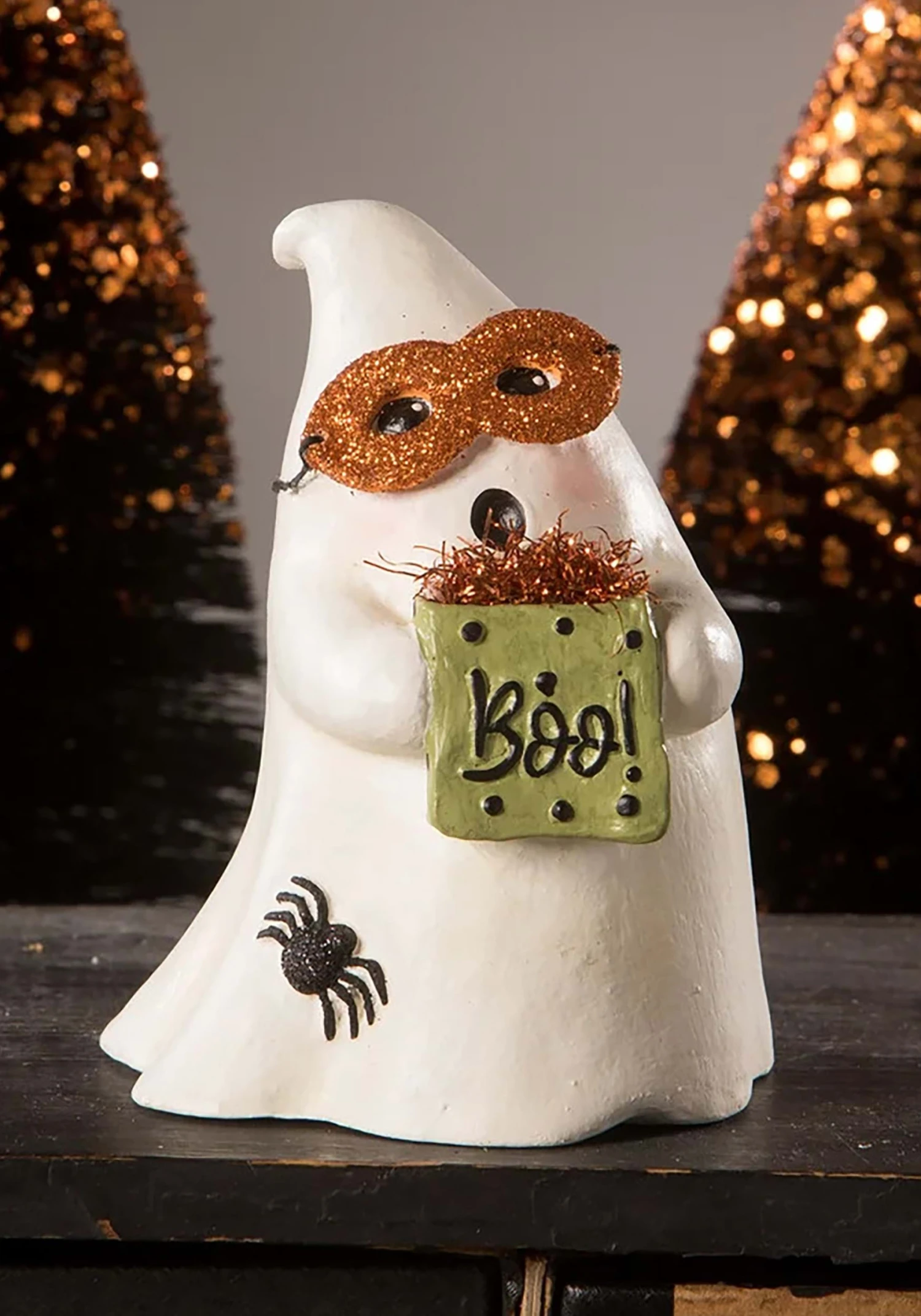 No one is more excited than your friendly local spirits when Halloween rolls around. It’s a holiday all about their favorite things: Bumps in the night, creative disguises, and candy (just because they can’t eat it doesn’t mean that they don’t like to see other people enjoy it). This sweet little paper ghost’s mouth is open in an admiring “o” beneath a glittery orange mask. A black spider crawls up its white robe and it holds a treat bag printed with the word “Boo!” It makes the perfect table-topper or party decoration.Â