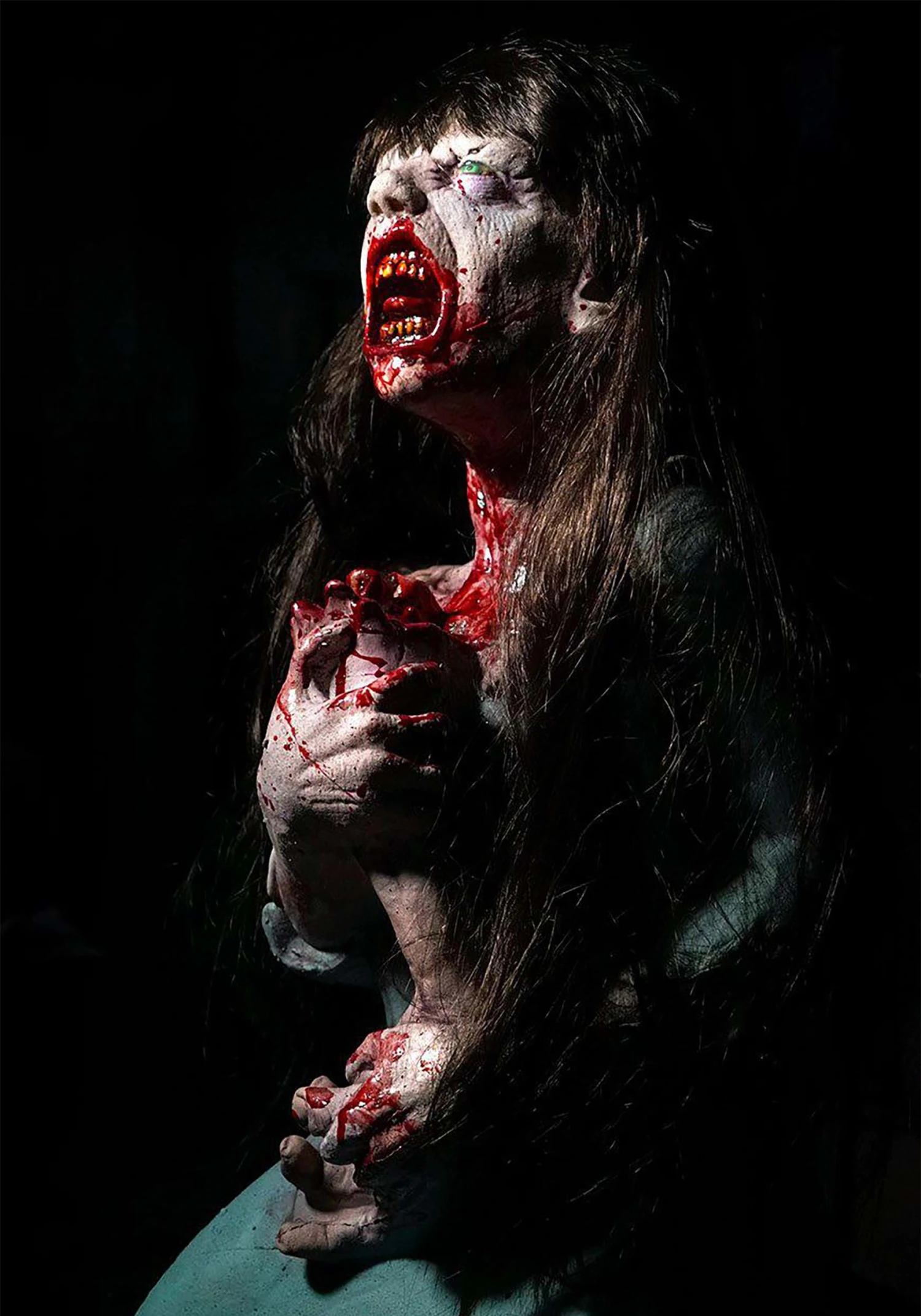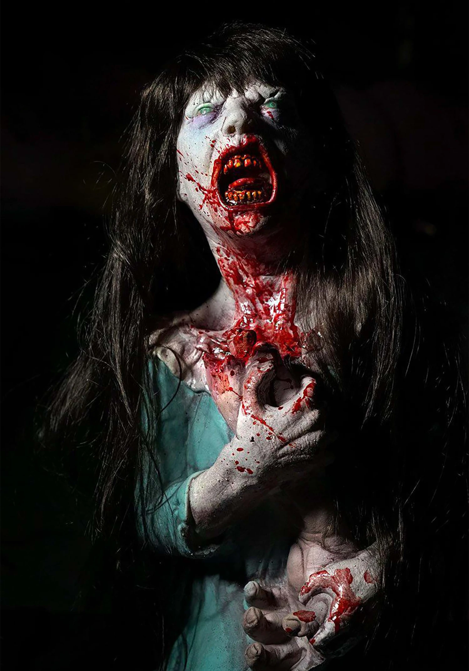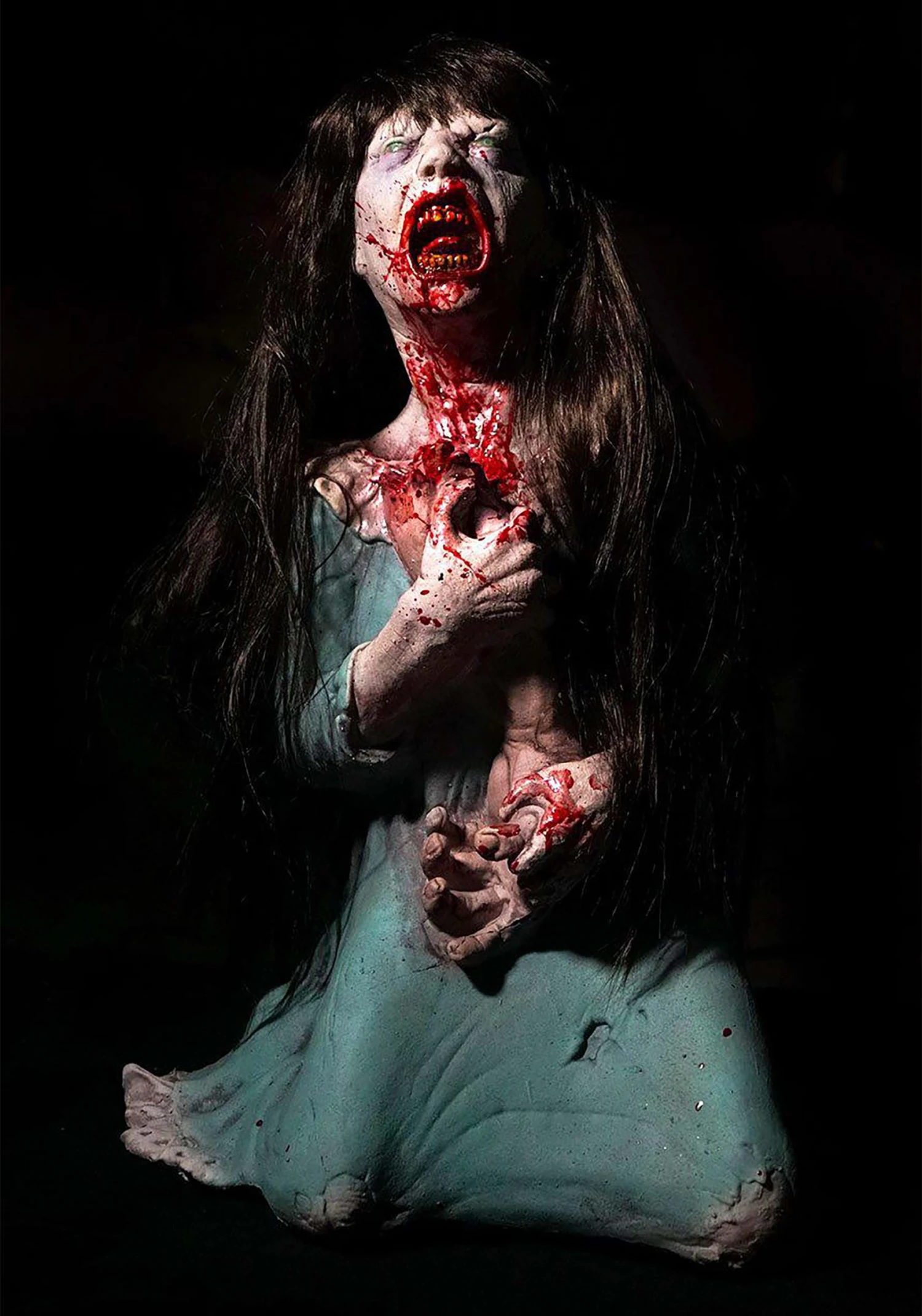 As realistic as this decoration appears, it’s actually just made out of a combination of latex and foam. It’s shaped into the figure of a small girl, who seems to be possessed by supernatural forces. It also features an amazing paint job, complete with blood splatters. And that face? Well, it looks real enough to make any guest who enters your home feel like they stepped onto the set of a new horror movie.