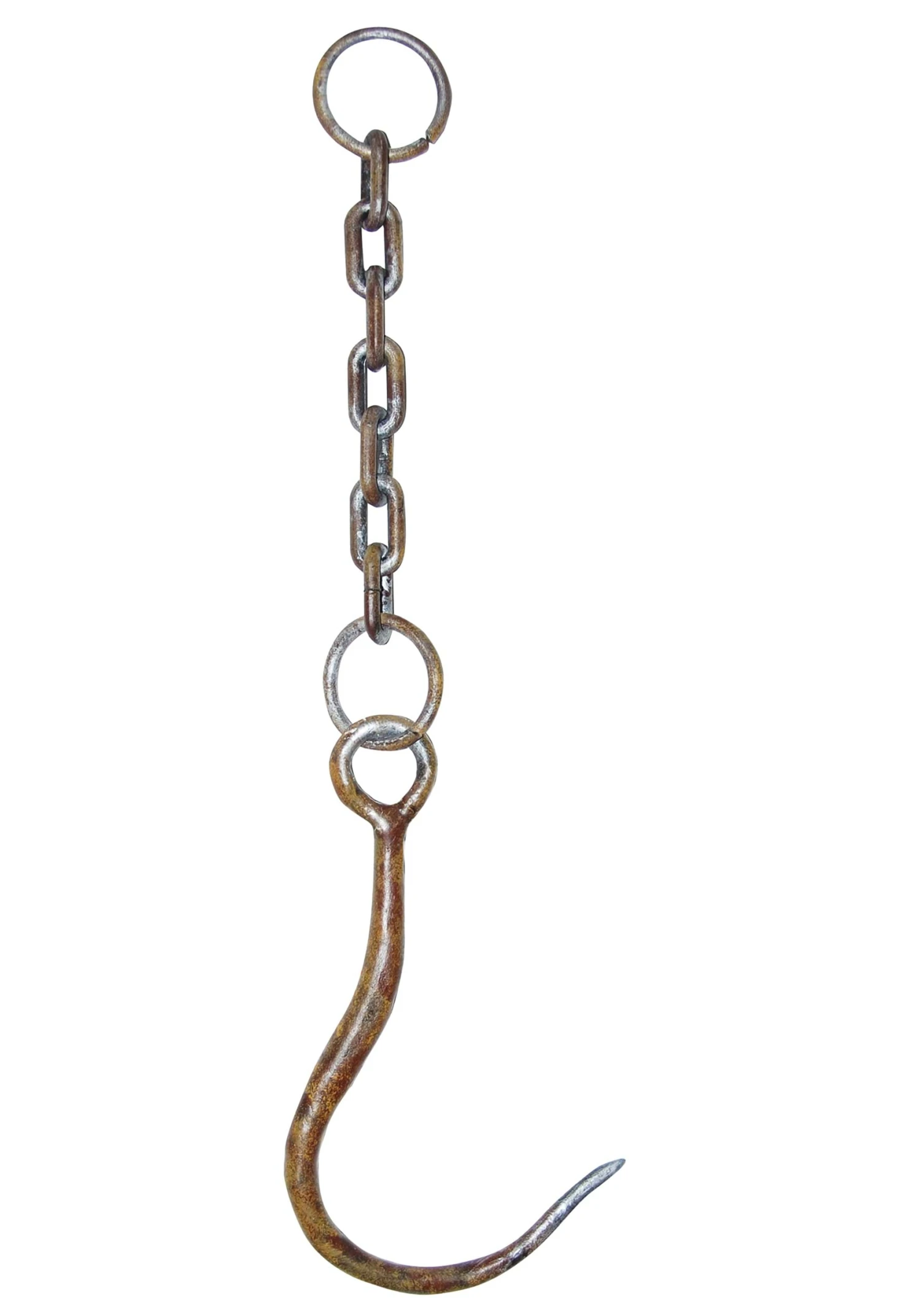 No one else will have a decoration quite like your Bloody Hook Decor! The metallic hook is painted with bloody-looking spatter and attached to a chain that ends in a large O-ring.Â