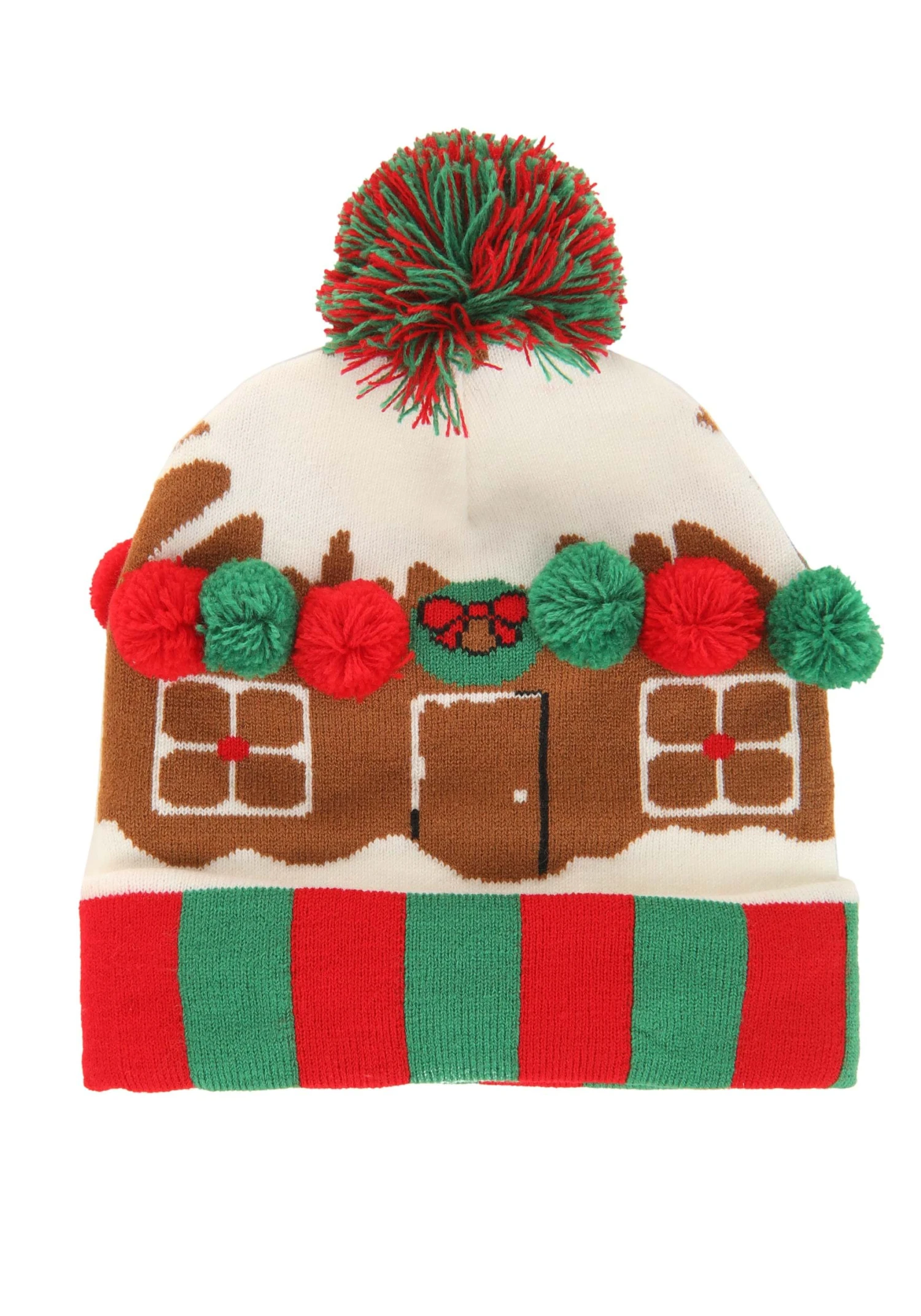 - Body of hat has knitted in graphic of a house w/ snow covered roof, door, & 4 windows