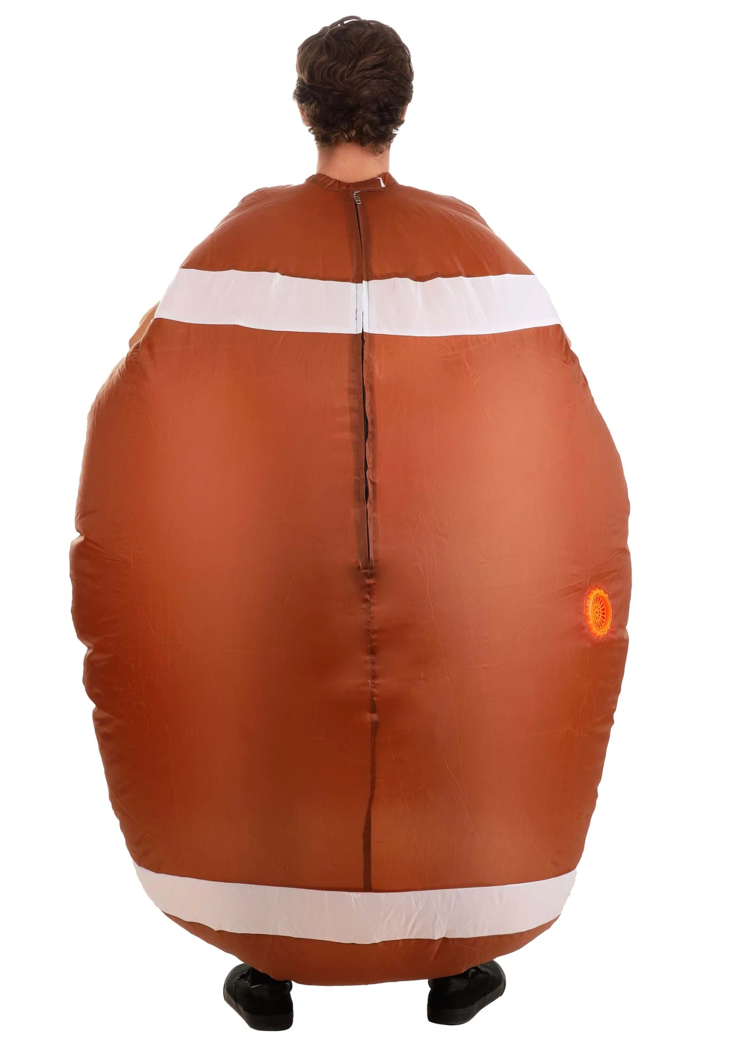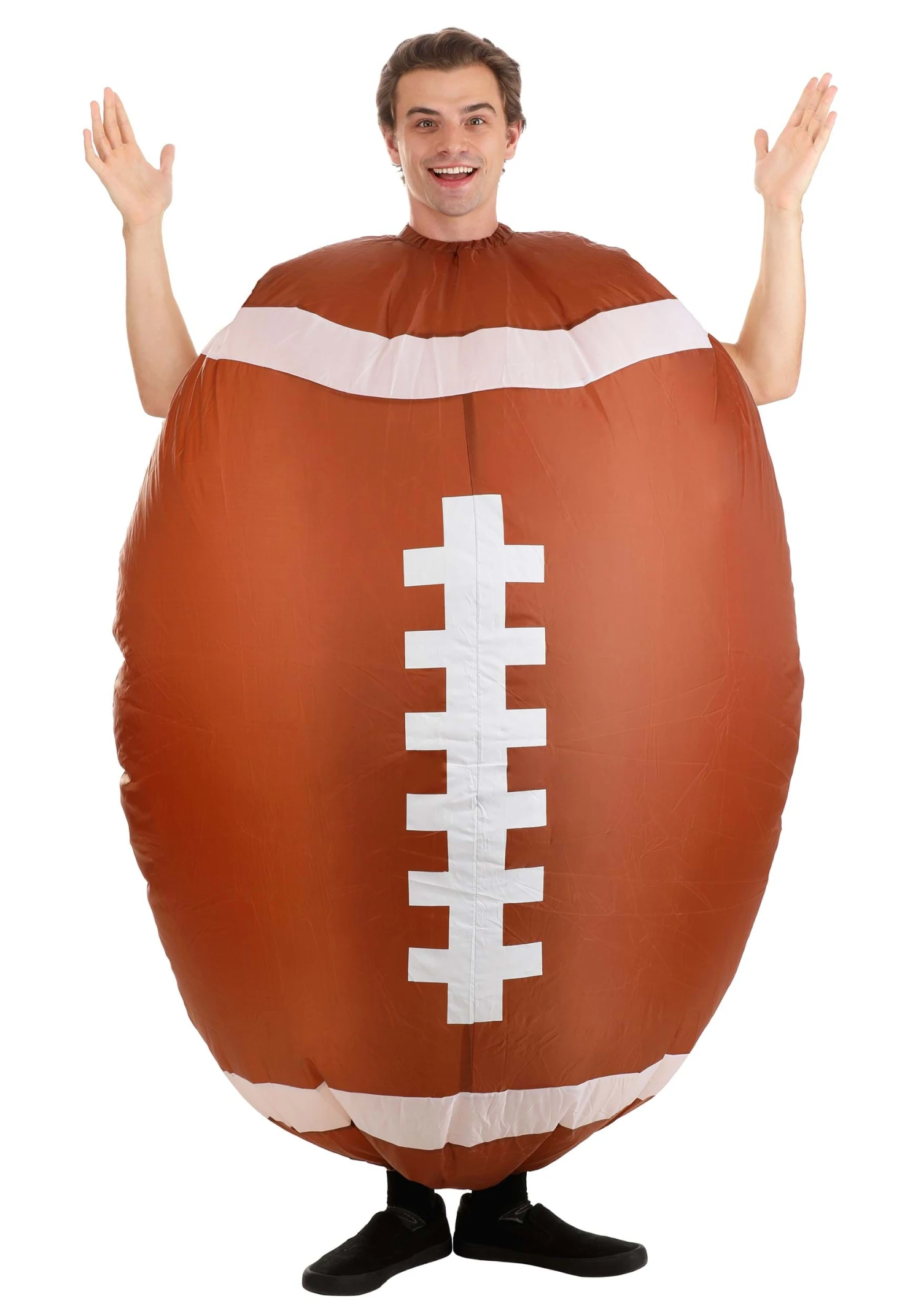 If you’ve been waitin’ all day for Sunday night, you’re going to love wearing your exclusive Inflatable American Football Costume for Adults! The unisex bodysuit zips up the back and features elastic inside its arm and leg openings. Its brown windbreaker fabric is printed with a horizontal white stripe at the top and bottom, as well as printed white “lacing” details up the front. A small, battery-operated fan is installed at the back right side. When fully inflated, the suit is shaped like a giant football.Â