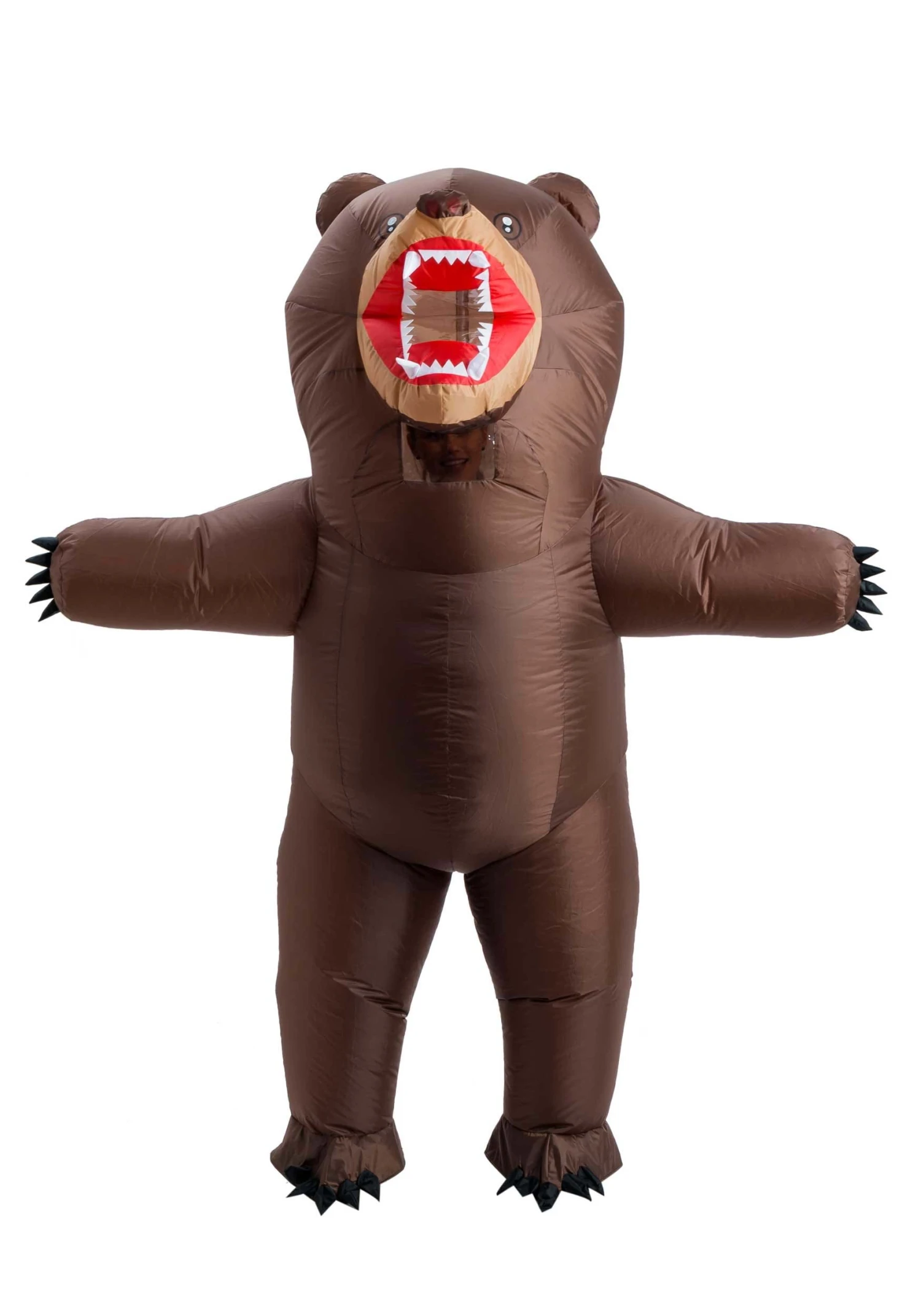 This bodysuit fully inflates thanks to an internal battery pack and fan (batteries not included). The zipper pull is inside the costume, so you can get in and out of it yourself, and there is a clear panel in the bear’s mouth so you can see the world as you prowl through it.