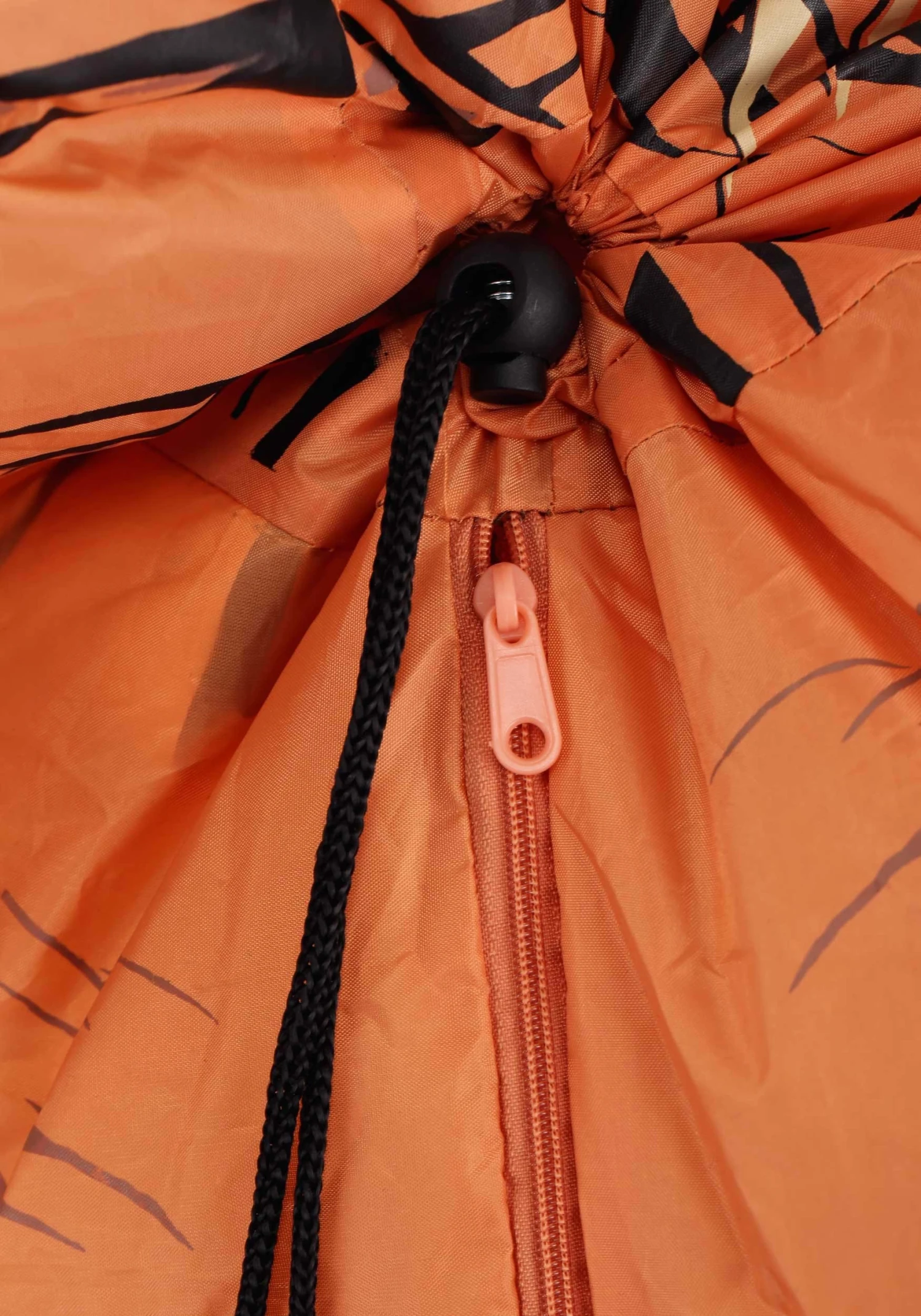 - Drawstring with cord lock around face opening in character neck