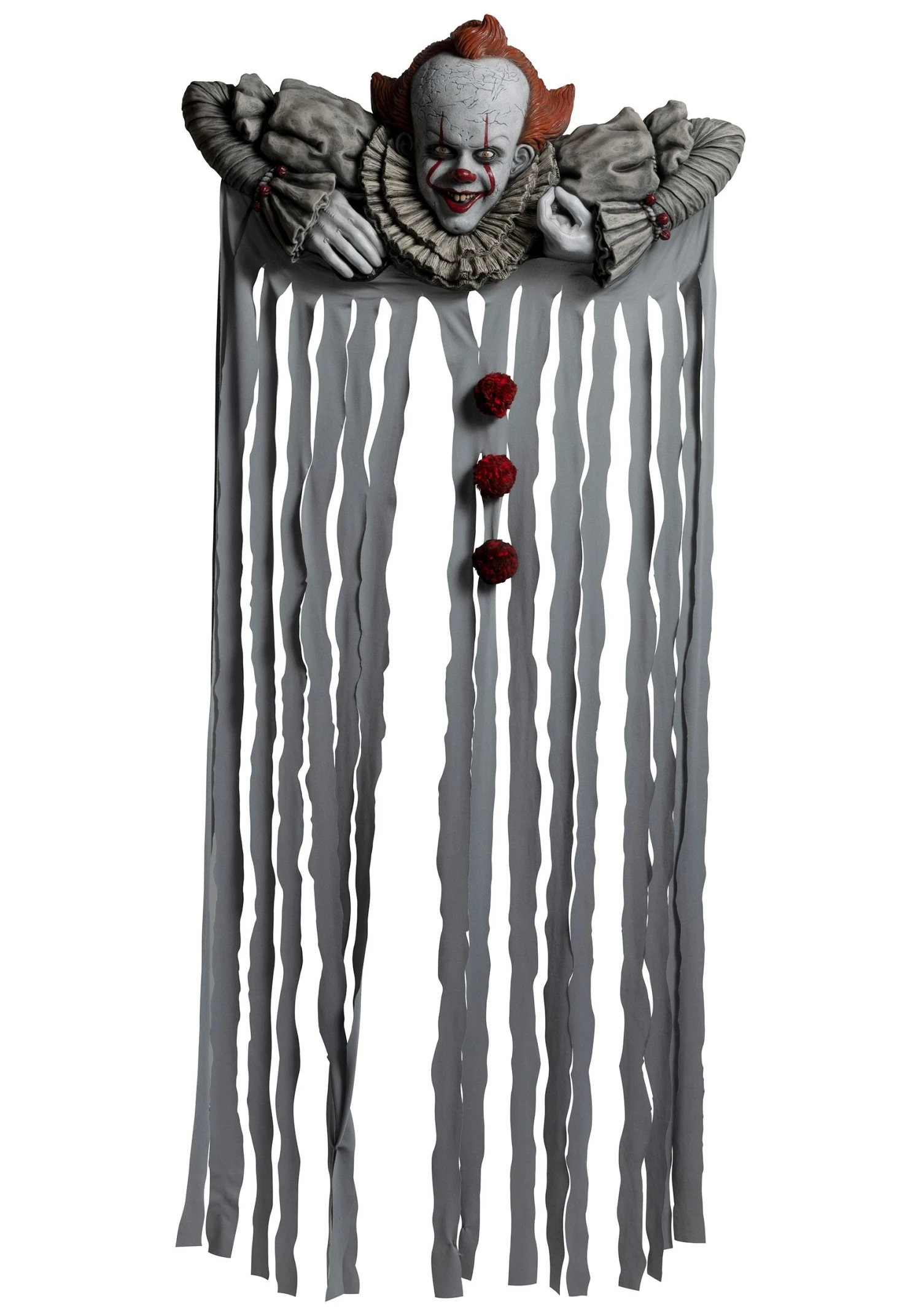 Fixing to the top of your door jam, this Pennywise figure has a grey, grim color, and Pennywise’s trademark wide grin. The grey fabric streamers fall down into the opening. The center has red pompoms down the middle for a look that will add a little color to your grey nightmarish festive scene!