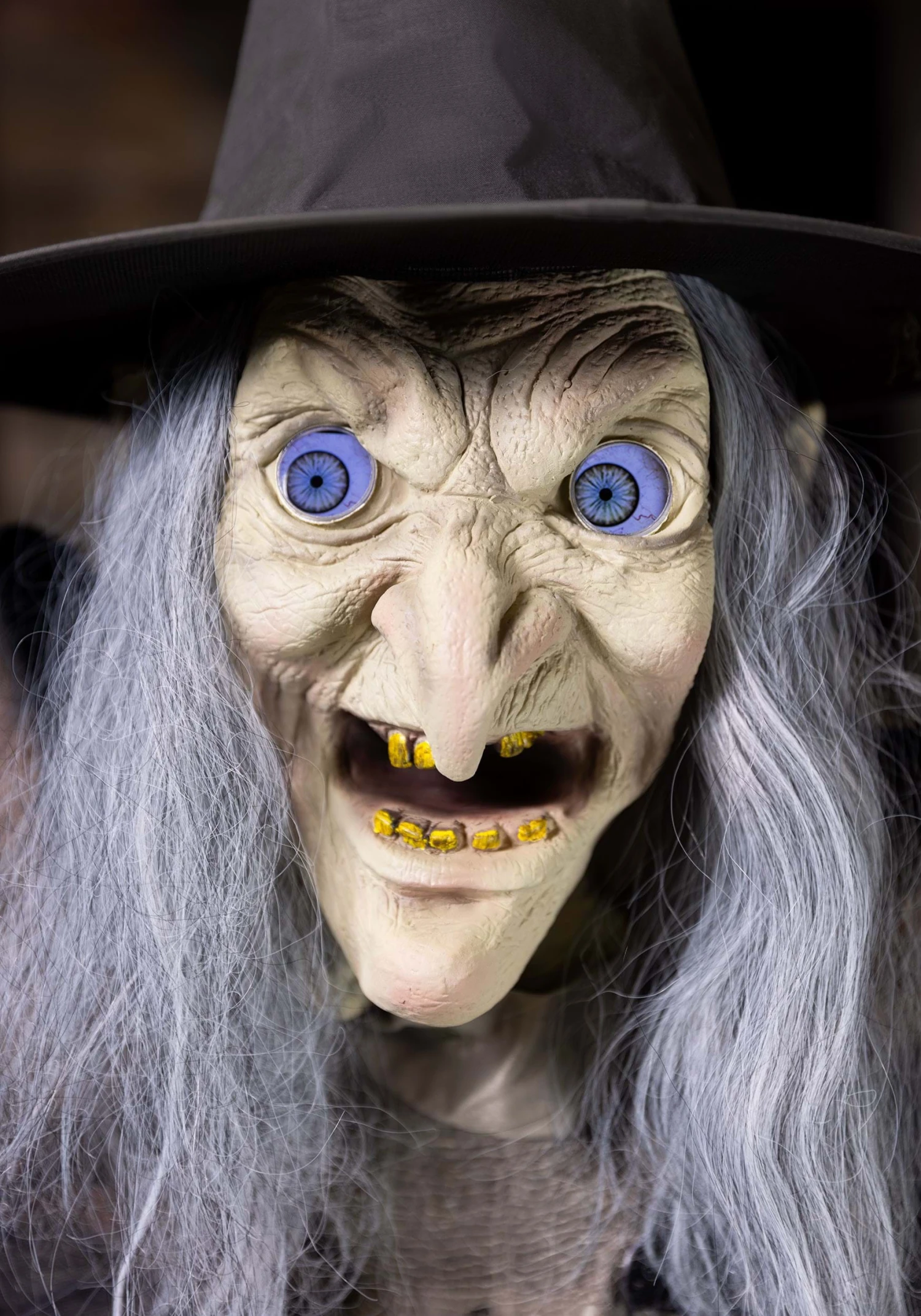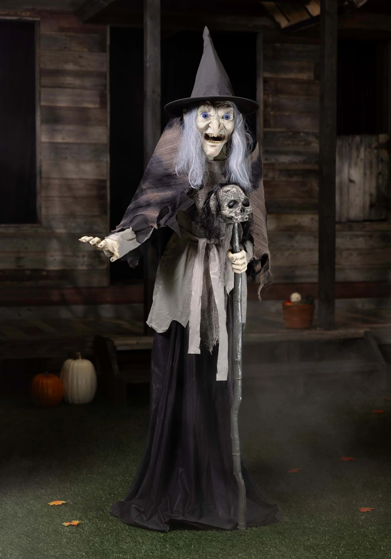 Plug this witch into an outlet with the universal adapter and she’ll be ready to frighten anyone who passes by! She runs in three different settings. Choose from steady-on, motion sensor, and the step-here pad. Her cackles and four different sayings are volume controlled, letting you adjust the sound to your surroundings. The witch’s face is highly detailed, moving with her witty phrases while her glittering eyes are enhanced by Digiteye technology. Lunging at friends and neighbors when they least expect it, this witch is sure to cause shouts of fear and delight throughout the holiday season. You can be sure that everyone will look forward to facing this witch for many Halloweens to come!