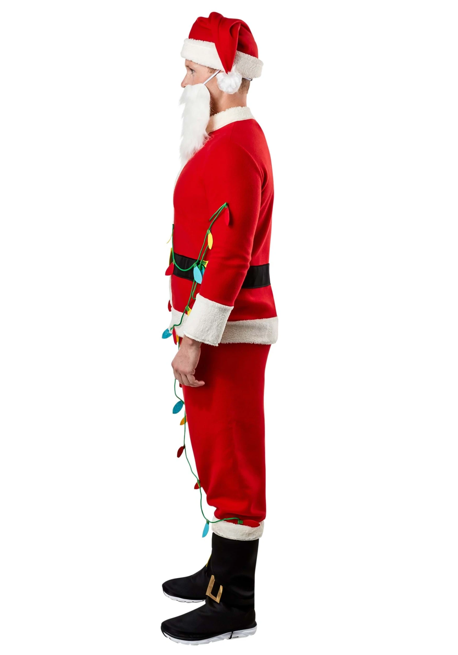 This officially licensed National Lampoon’s Clark Griswold Santa Costume for Men is a whole lot better than a one-year membership to the Jelly of the Month Club! The red top fastens at the back of the neck and features white trim on the sleeve cuffs, center front, and hemline. A black fabric belt with a gold-tone fabric buckle is sewn around the waist. The matching red pants tuck into the black fabric boot covers. The front of the costume has an applique of a long green cord from which dangle twenty-five hundred twinkle lights – um, we mean several colorful felt “lightbulbs.”Â