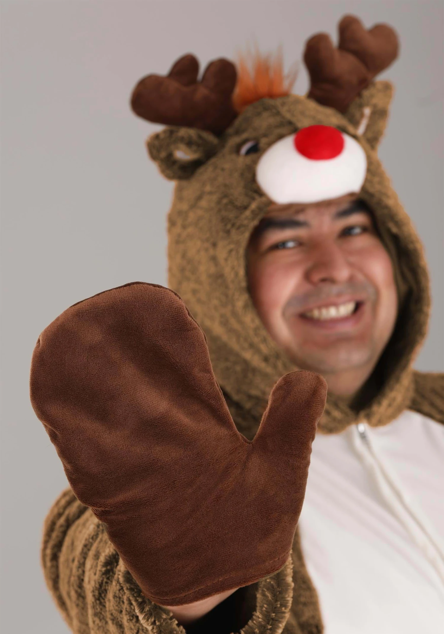 Included shoe covers and sewn-on mitts for your hands ensure that you’ll look like a reindeer from hoof to antlers! The hood is adorned with an adorable reindeer face to finish off the outfit. You’ll be ready to pull Santa’s sleigh in comfort when you put on this festive ensemble!