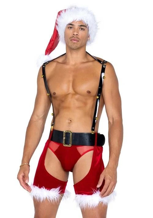 The included chaps match the briefs and even have some white, faux fur accents to add that perfect holiday touch to the outfit. The chaps fit with belt loops, which conveniently attach to the included faux leather belt. Finally, the suspenders bring the whole look together and fit with a pair of metal clips. The straps are adjustable, so you can get the perfect fit. The little bells on the front really help you bring the holiday spirit.