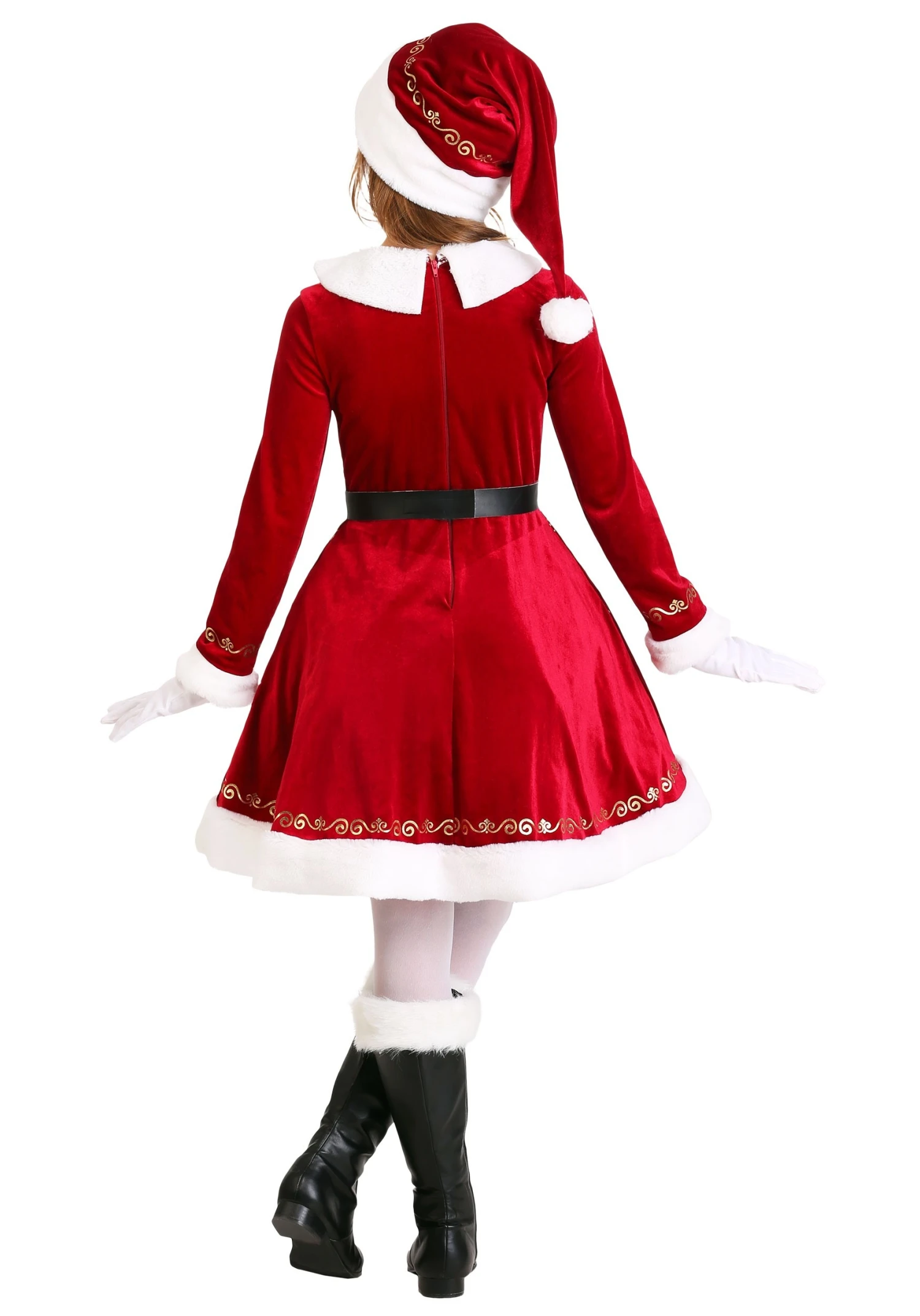 This costume dress was crafted by our team of designers. They took extra care to infuse it with the holiday spirit, which is why the dress is made out of a festive red velvet material. The tufts of white fur add a pop of snowy brightness to the look and the gold filigree designs put a polished holiday touch to the look. The zipper in the back makes it easy to change into and the faux leather belt cinches around the waist. The finishing touch to this outfit comes in the form of a matching red Santa hat. Once she’s wearing the full ensemble, she’ll be ready to hand out presents and eat those special Christmas cookies!