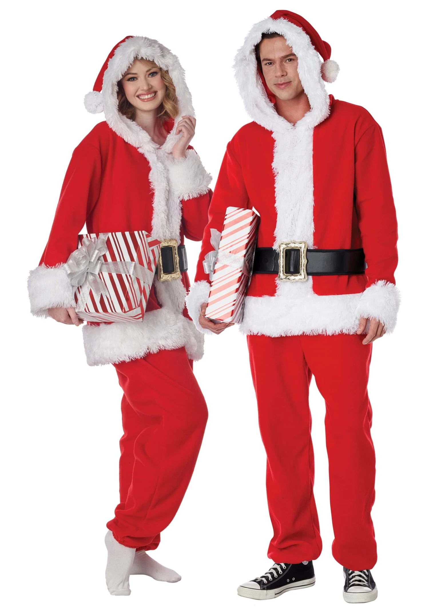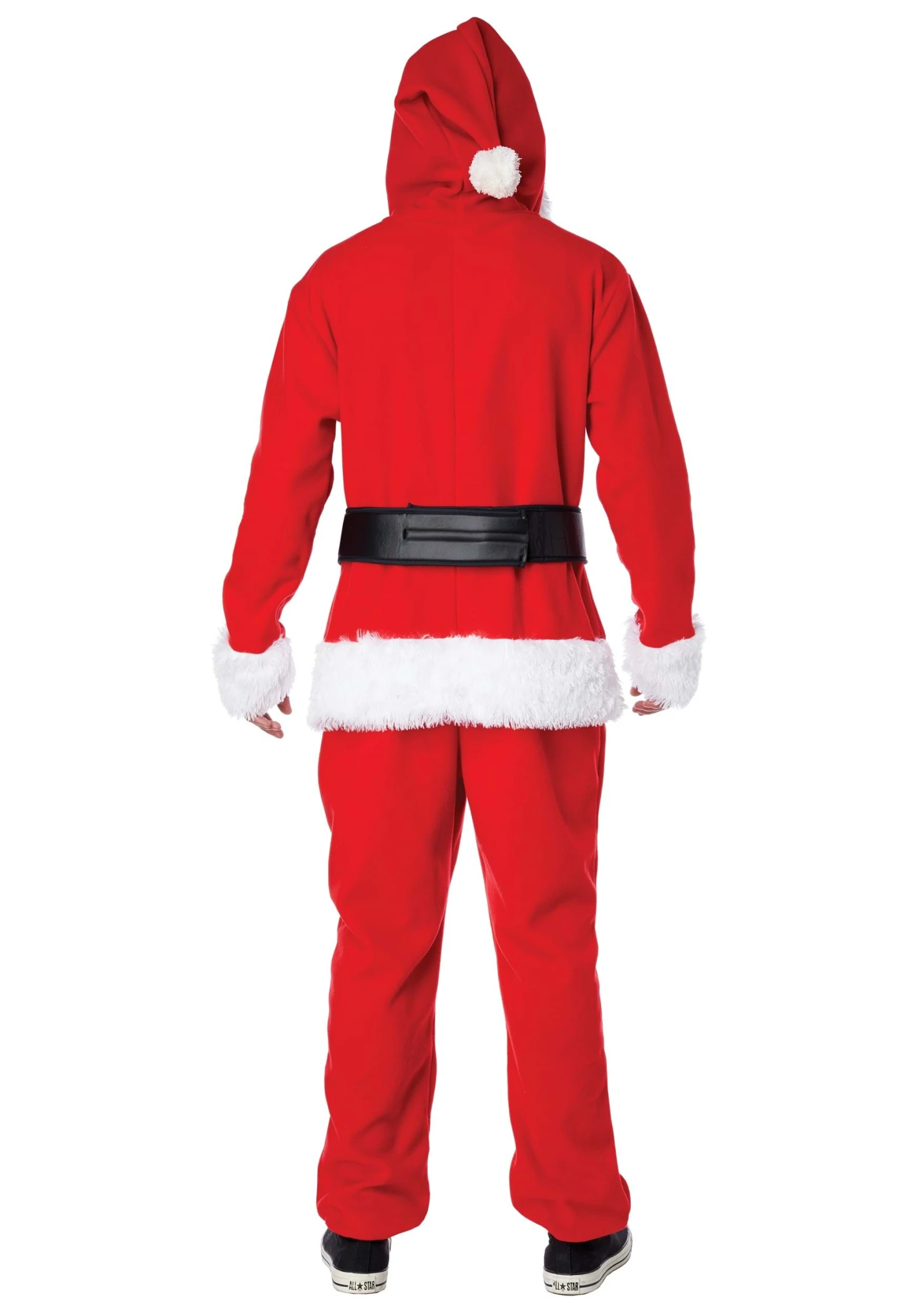 Make a list and check it twice – and then cross “Get a great costume” off of it because this unisex Santa’s Red Jumpsuit for Adults has you covered! The onesie-style outfit is made of red polyester fleece that’s as soft as magical reindeer fur (or so we hear), and is designed to look like a separate top and bottom. The jumpsuit’s upper half is lined with fluffy white faux fur around the sleeve cuffs and hips, up the front of the chest, and around the attached Santa-hat-shaped hood. The bottom half is solid red fleece with elastic in the ankles to keep your legs nice and warm. The finishing touch is a wide black belt complimented by a gold-tone plastic slide buckle that has intricate molding.Â