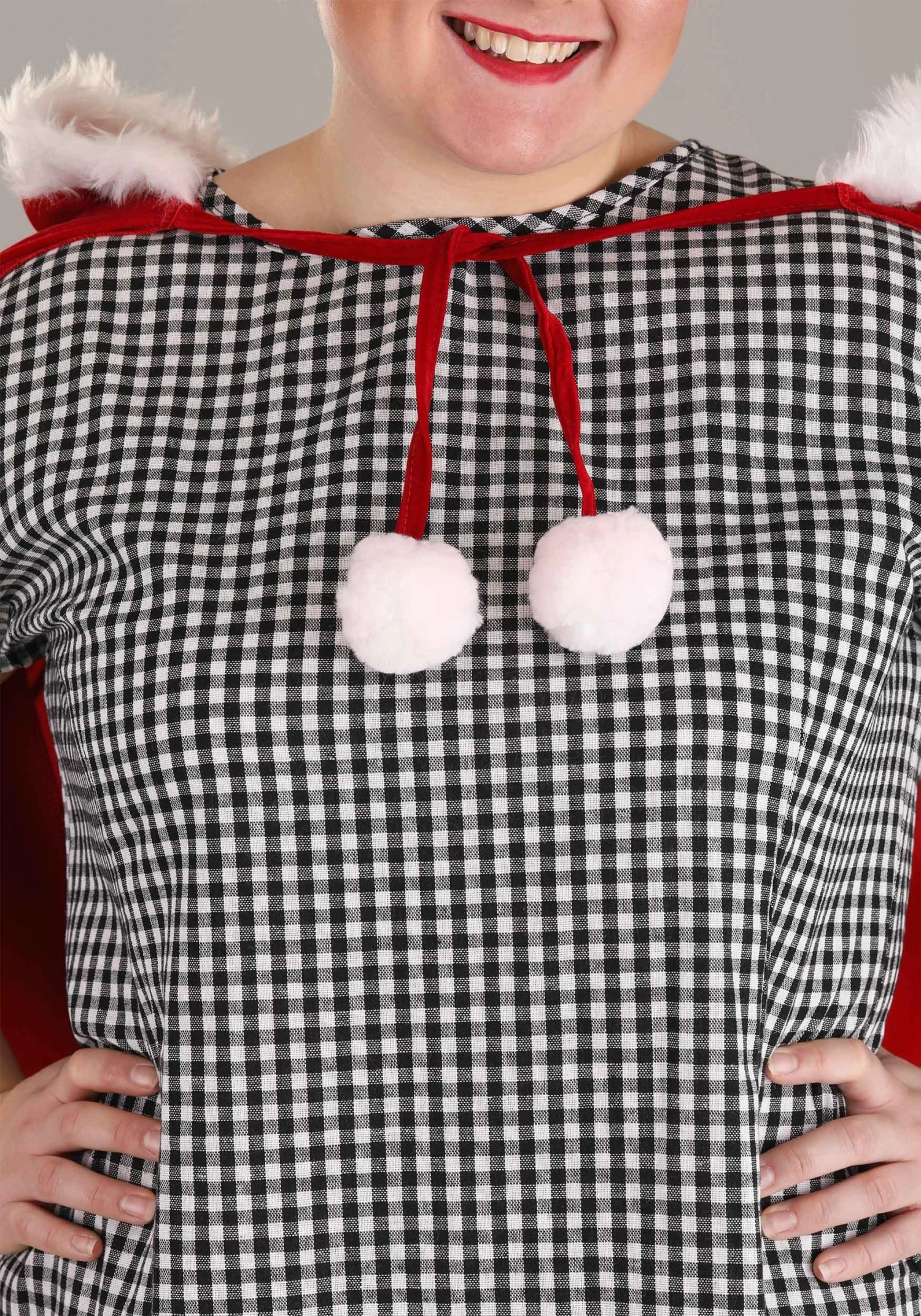 The dress features a cute, checkered design with ribbon trim along the bottom, while the faux fur trimmed cape will have you looking like you’re ready to wrap presents and trim the tree! Don’t be surprised if you feel the urge to start singing Christmas carols while joining hands with your neighbors. Remember to sing loudly to make even the Grinch feel all warm and fuzzy inside!